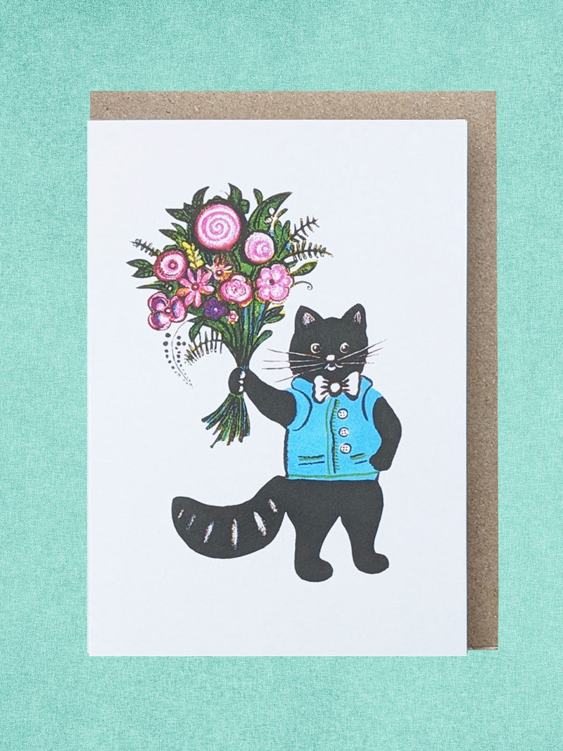 Kapelki Art Greeting Card - Black Cat with Flowers