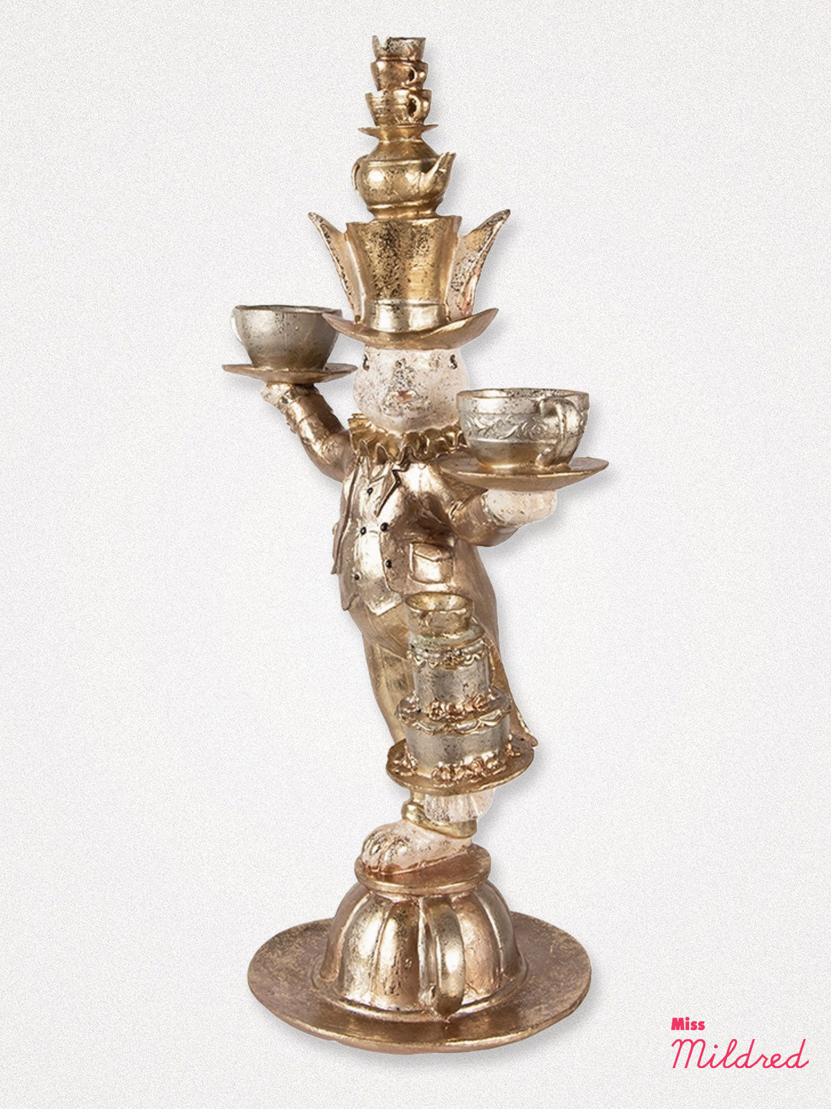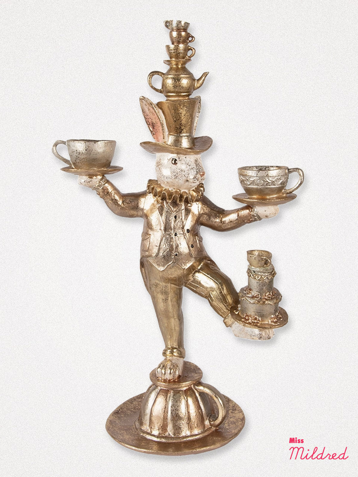 Finished in a vintage gold effect finish, this stunning tea party rabbit statue is the ultimate centrepiece for any bunny loving or quirky decor stylist home.