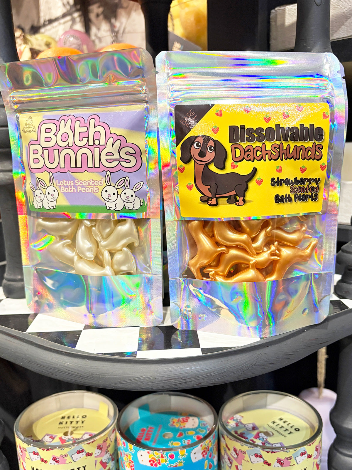Colourful, squidgy bath pearls filled with a lotus scent and shaped like bunnies!