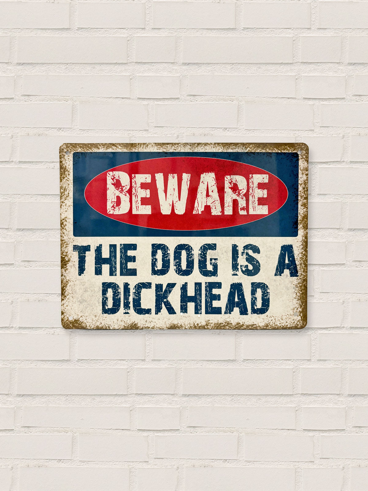 Decorative, funny metal 'Beware The Dog Is A Dickhead' tin sign.