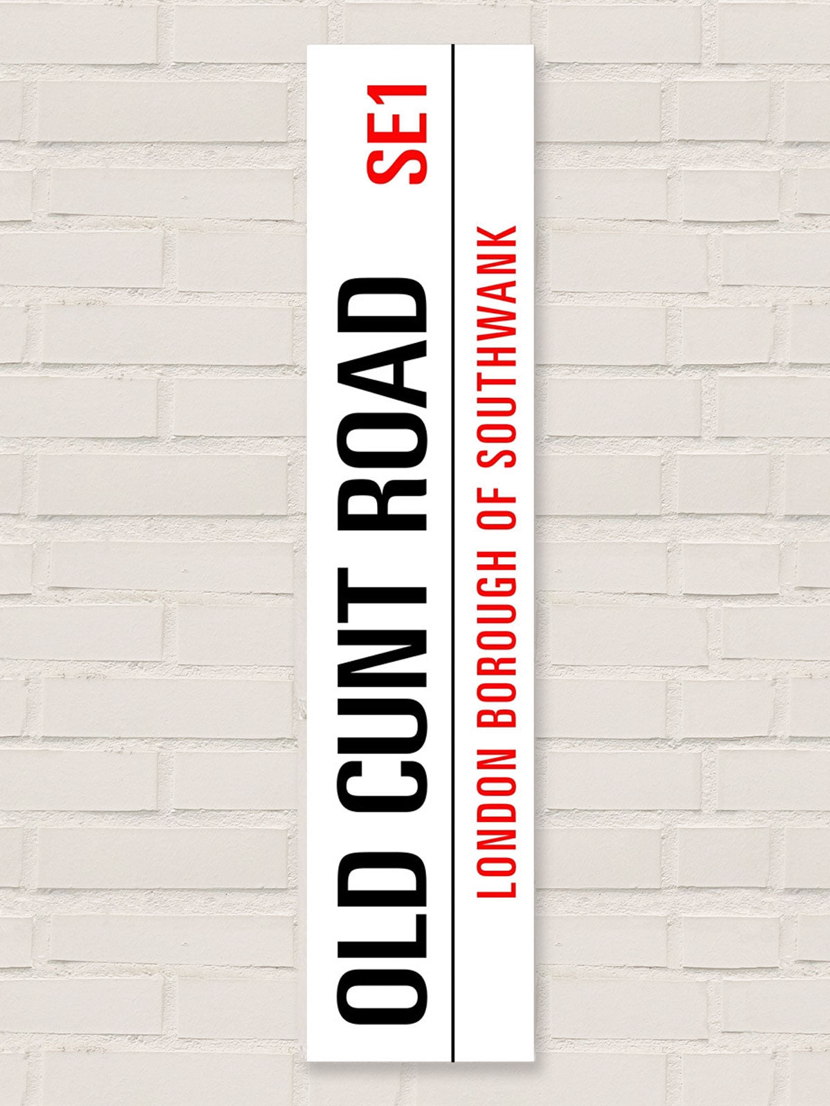 Decorative aluminium tin sign with the words 'Old Cunt Road', 'Borough Of Southwank'.