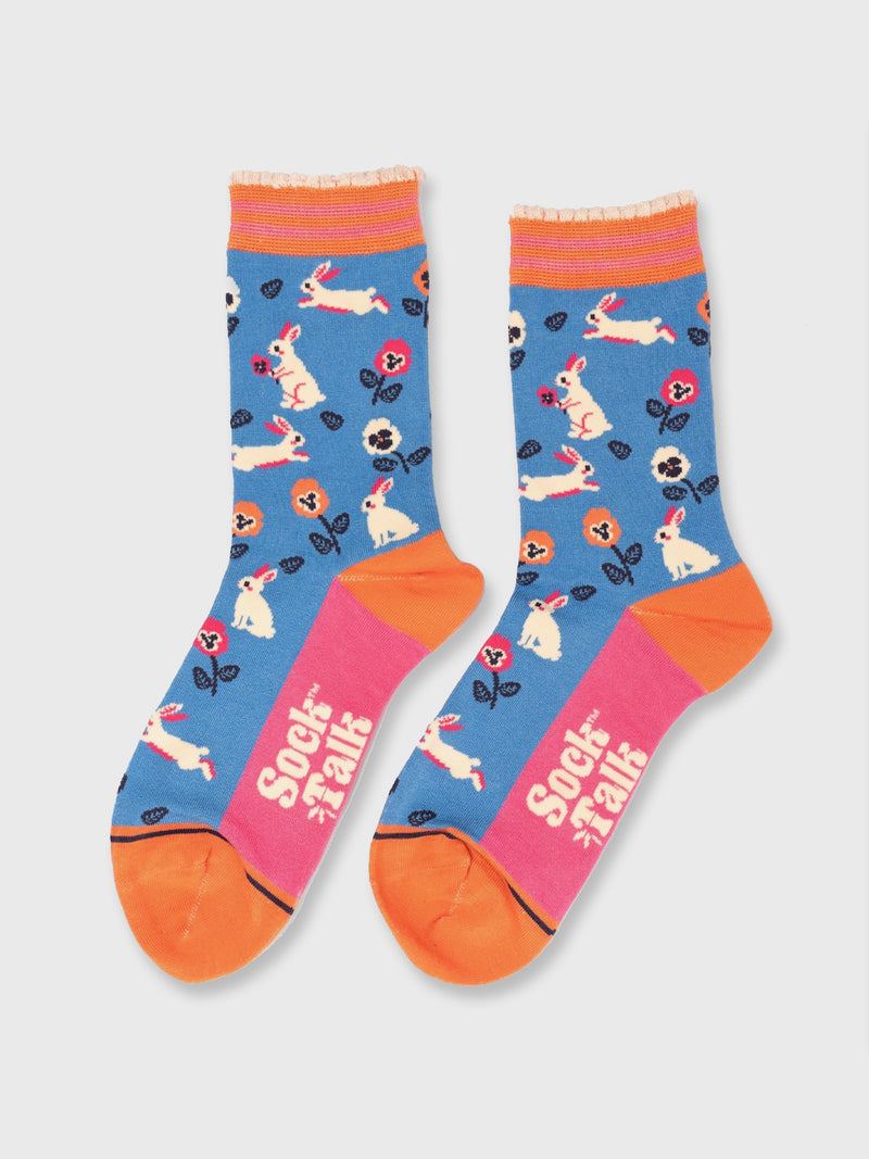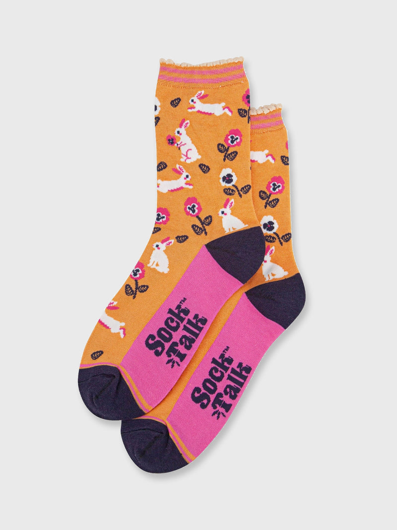 Bunny and Flowers Bamboo Socks Orange - Ladies